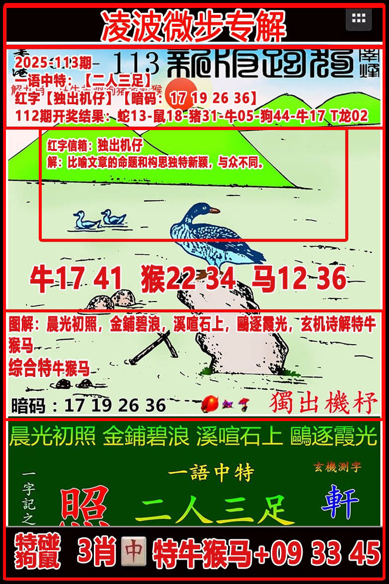解析:晨光初照,金鋪碧浪。溪喧石上,鷗逐霞光。解特:猪虎猴狗牛鸡马